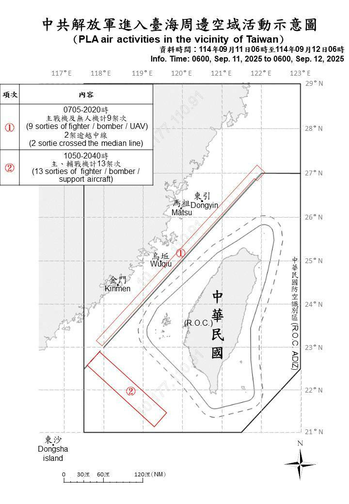 根據國防部圖資顯示,自昨上午7時5分至晚間8時20分,中共出動主戰機及無人機共9架次,沿著台海中線活動,其中2架次逾越中線;另外,自昨上午10時50分自晚間8時40分,有中國主、輔戰機13架次在台灣海峽中線以東、我西南空域活動,合計15架次越線。