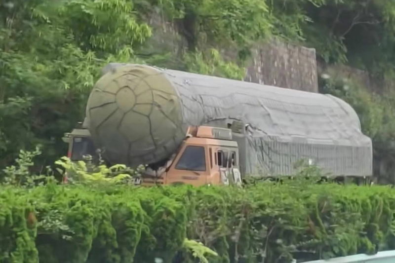 中國一輛罕見披上單色「原木風格」偽裝的東風-41洲際彈道飛彈發射車,6月中旬現身,引發軍事觀察家關注。(圖:X平台用戶 @chaoyinsukandao)