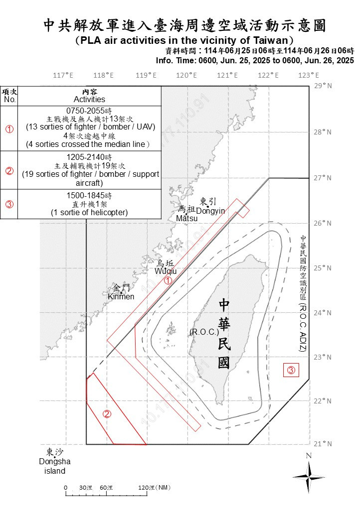 據國防部即時軍事動態資料,針對中共解放軍台海周邊海、空域動態,自25日早上6時至26日早上6時止,國軍偵獲共機33架次(其中逾越海峽中線進入北部、西南及東部空域24架次)及共艦5艘,持續在臺海周邊活動。