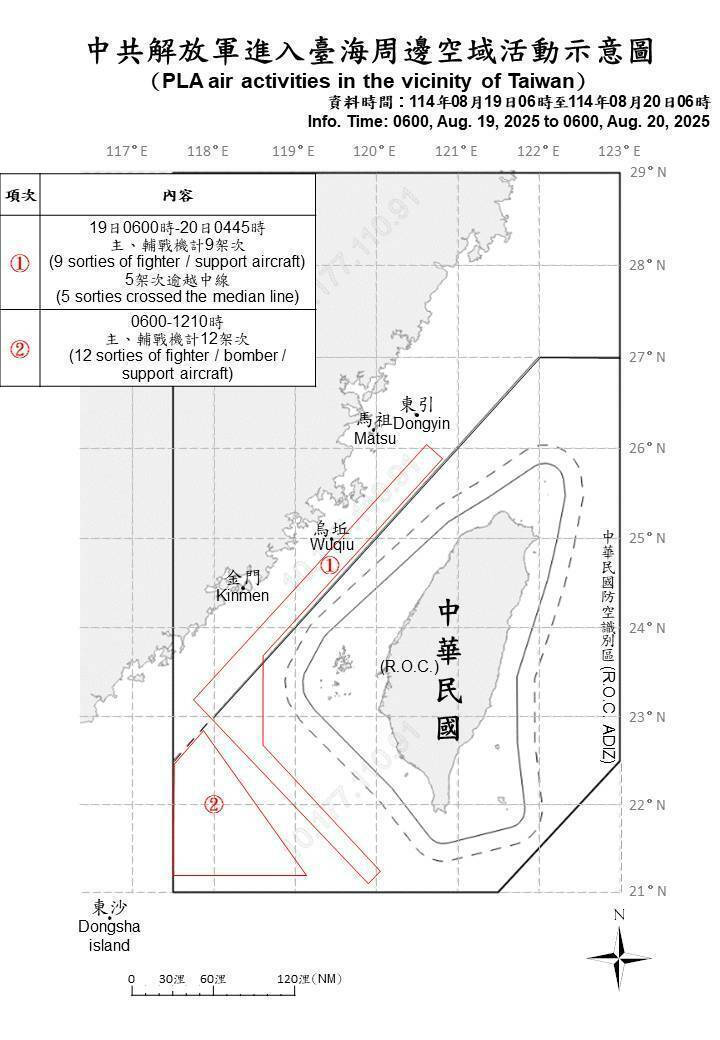 〔記者方瑋立/台北報導〕中國持續對台灰色地帶襲擾,國防部今(20)日指出,從昨(19)日上午6時至今上午6時,國軍偵獲共軍21架次軍機與7艘次軍艦,持續在台灣海峽周邊海空域進行活動。