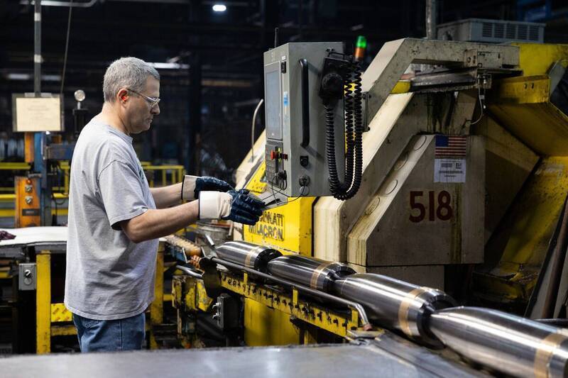 美國陸軍近期批准捷克投資設廠加蓋155公厘彈藥工廠,使目前每月4萬枚砲彈產量,提升至2026年中的10萬枚。圖為美國賓州一處陸軍工廠的員工正在產製砲彈。(彭博社)