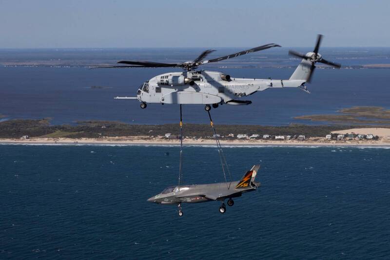 CH-53再度執行「經典吊掛」 首架退役F-35B落腳新家靜態展示