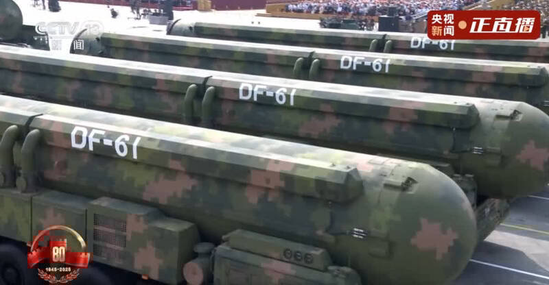 中國解放軍首度同時展示「三位一體」戰略核武力量。(圖擷自央視直播畫面)