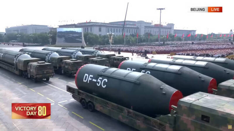 在戰略武器方面,此次閱兵最令人矚目的,是首度公開亮相的東風-5C(DF-5C)洲際彈道飛彈。此為中國第一款洲際飛彈東風-5系列的最新改良型,據信其酬載能力大幅提升,可攜帶多達10枚「多目標重返大氣層載具」(MIRV)核彈頭,意味著一枚飛彈便可攻擊10個不同目標。