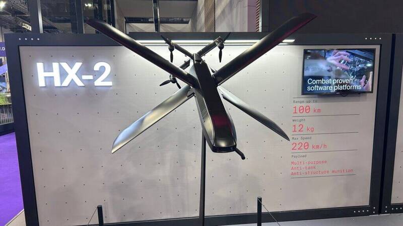 德國國防AI新創公司赫爾辛(Helsing)於2025年的DSEI防務展上,展示其HX-2 AI驅動打擊無人機的模型。此型無人機將成為赫爾辛與丹麥Systematic公司合作的核心硬體,旨在為歐洲提供AI蜂群作戰能力。 (圖:Helsing)