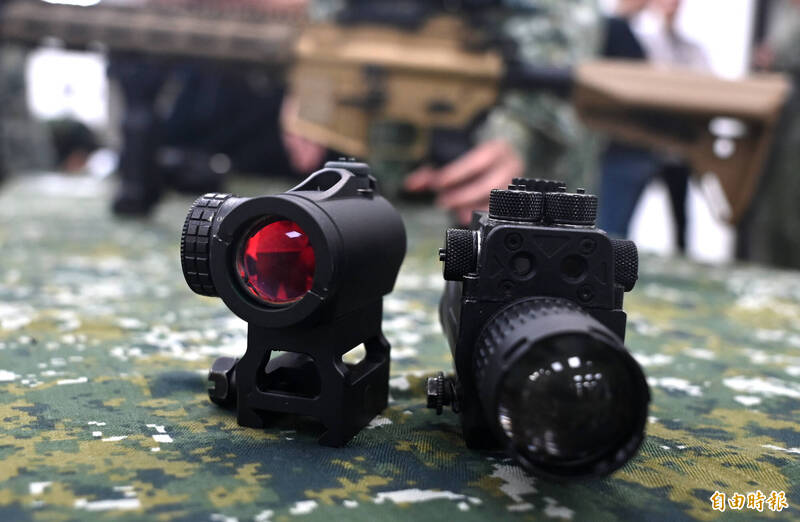 國造TS112式反射式內紅點瞄準鏡(左)、TS112雷指器(右),都是T112步槍的配件。(資料照,記者王藝菘攝)