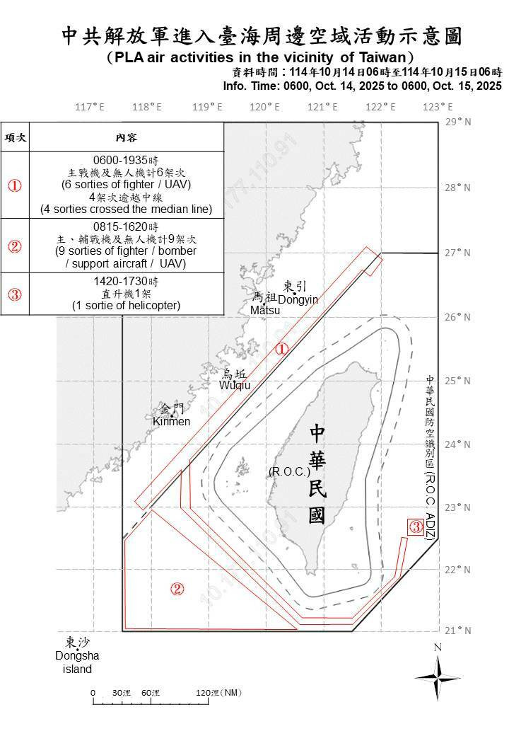 根據國防部公布的航跡圖顯示,共軍分三個時段活動,首波自昨上午6時至晚間7時35分,共出動主戰機及無人機6架次,其中4架次逾越中線,進入北部及西南空域;第二波於昨上午8時15分至下午4時20分間,包含主、輔戰機及無人機共9架次,在西南及南部空域活動;第三波則在昨下午2時20分至5時30分間,出動1架直升機於東南空域活動。