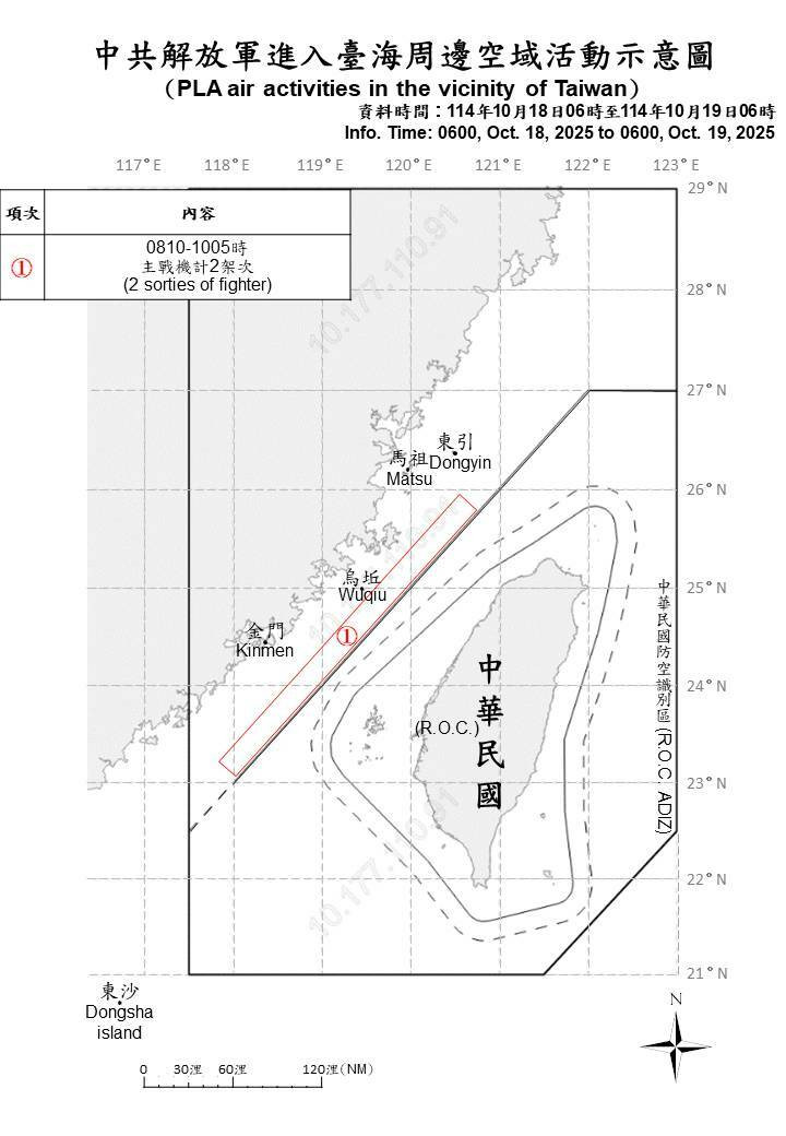 〔記者黃靖媗/台北報導〕國防部今(19)日表示,自昨日上午6時至今日上午6時止,國軍偵獲共機2架次。