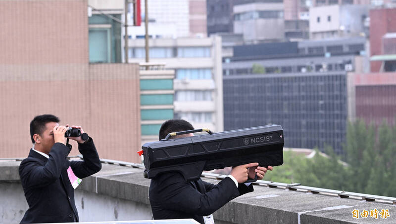 安全人員在2023年國慶日時,在制高點持干擾槍保持警戒。(資料照)