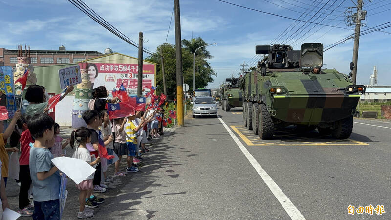 陸軍機步234旅將參與今年度陸勝一號操演。圖為聯兵一營雲豹甲車去年偵巡時,白河幼兒園小朋友列隊歡迎。(資料照)