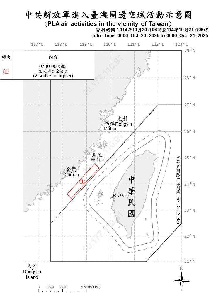 〔記者黃靖媗/台北報導〕國防部今(21)日表示,自昨日上午6時至今日上午6時止,國軍偵獲共機2架次。