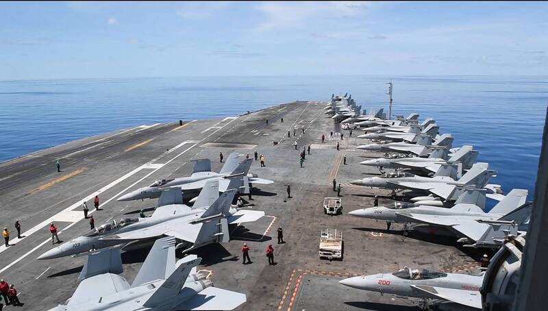 美軍尼米茲號航艦與F/A-18艦載戰鬥機。(法新社檔案照)