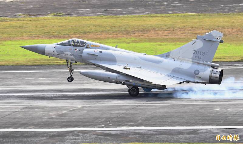 圖為2023年完成戰術專精訓練的幻象2000-5戰機,其左翼下所掛載的,即為「空戰即時演訓系統莢艙」。(本報資料照,記者游太郎攝)