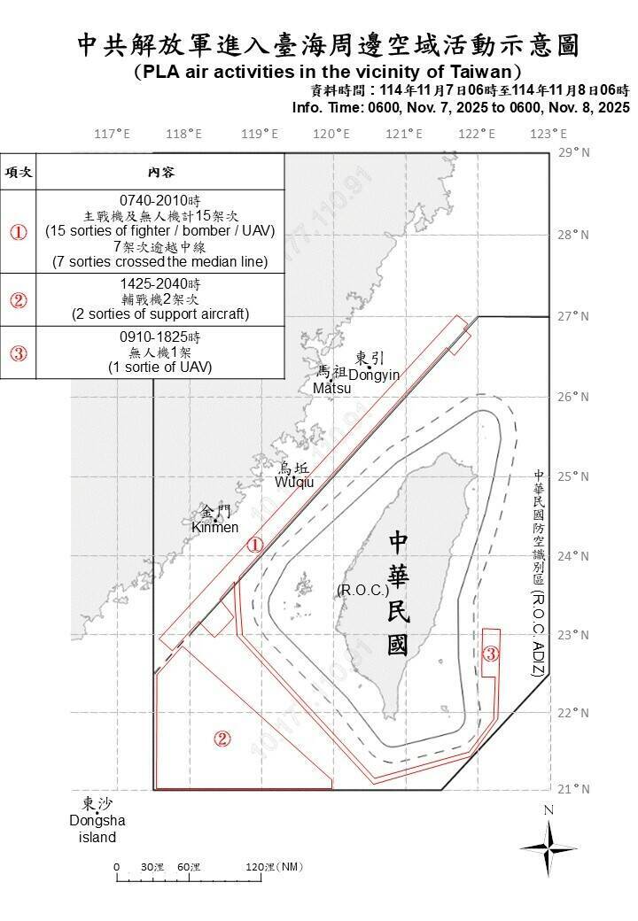 〔記者方瑋立/台北報導〕中國對台灰帶襲擾不斷,國防部今(8)日表示,自昨(7)日上午6時起至今日上午6時止,持續偵獲共機18架次、共艦7艘及公務船1艘,在台海周邊海空域持續活動。其中,共有10架次共機逾越海峽中線進入臺灣北部、西南部及東部空域,國軍運用任務機、艦及岸置飛彈系統嚴密監控與應處。