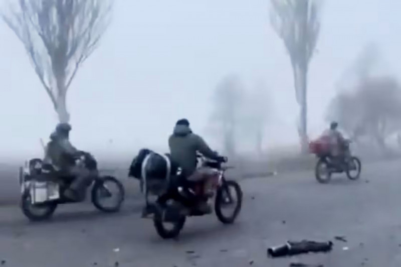 俄軍士兵騎乘機車,在濃霧中攻入烏東重鎮波克羅夫斯克。此一場景被形容宛如電影《瘋狂麥斯》。(路透)