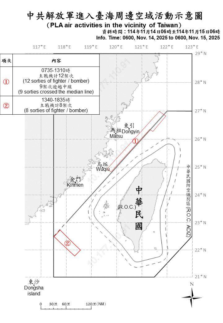 〔記者方瑋立/台北報導〕國防部今天(15日)公布,自昨(14)日上午6時至今上午6時止,偵獲中共解放軍各型軍機20架次及海軍艦艇6艘,持續在台灣周邊海空域活動。其中有17架次軍機逾越台灣海峽中線,進入我北部及西南空域活動。