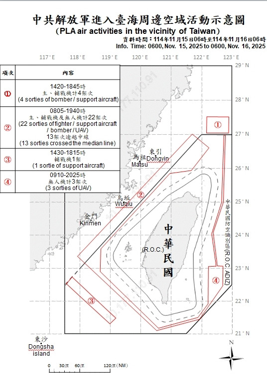 國軍資料顯示,4架次共軍主、輔戰機侵擾我北部空域;22架次共軍主、輔戰機及無人機侵擾我西部空域,其中13架次逾越中線;1架次共軍輔戰機進入我西南空域;3架次共軍無人機進入我東部空域。