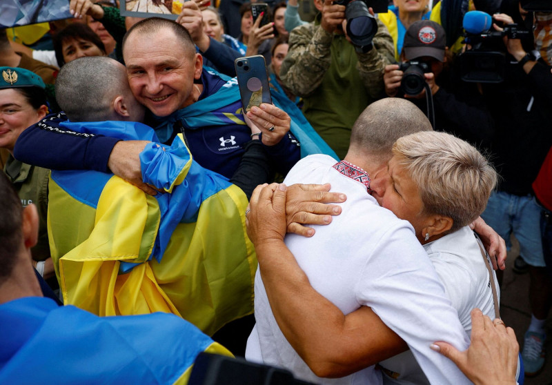 烏克蘭稱正尋求與俄羅斯恢復交換戰俘。圖為2025年8月24日在烏國某處拍攝的換俘畫面,顯示烏國戰俘的家人熱情擁抱經換俘行動得以獲釋返國的烏國士兵。(路透)