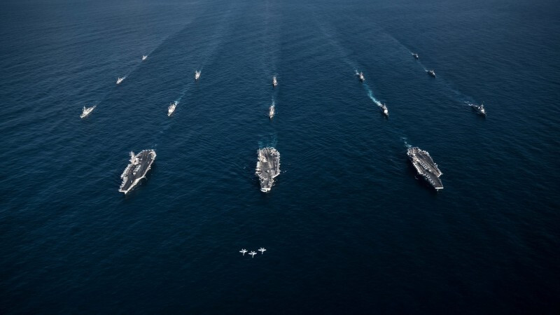 蘭德報告強調,單靠經濟制裁難以嚇阻中國犯台,必須結合可信的軍事準備。圖為美軍航空母艦雷根號、尼米茲號和羅斯福號。(路透資料照)
