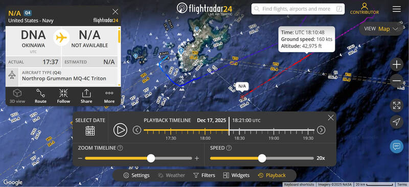 「Taiwan ADIZ」粉專進一步分析航跡,推測當時遭共艦驅離的對象,極有可能是從日本沖繩嘉手納基地起飛的MQ-4「人魚海神」無人偵察機。