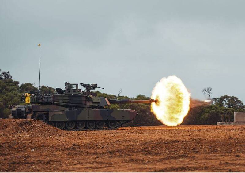 M1A2T戰車砲口迸發熾熱火光,揚起陣陣塵土,震撼聲響徹訓場。(圖:取自青年日報)