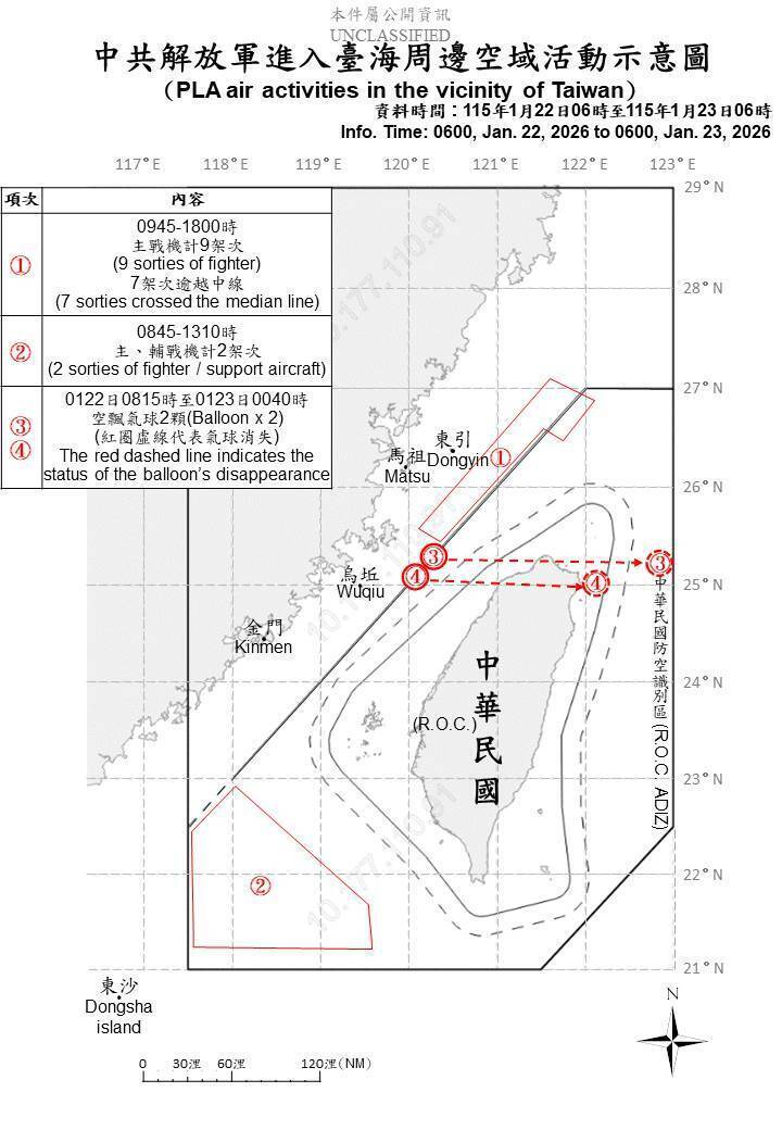 此外,國防部也同步掌握中共空飄氣球動態,合計偵獲2顆氣球。其中1顆於昨天上午8時15分偵獲,位於基隆以西77浬,高度1萬5000呎,並於上午10時55分消失;另1顆則於昨晚10時15分偵獲,位於基隆西南85浬,高度1萬7000呎,直至今天凌晨0時40分消失。