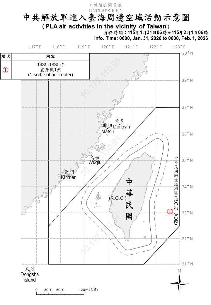 國軍資料顯示,1架次共軍直升機進入我東部空域。
