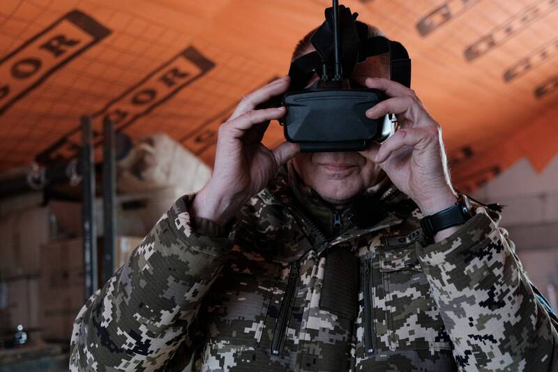 在俄羅斯入侵期間,一名烏克蘭士兵在試戴用於操控無人地面載具(UGV)的第一人稱視角(FPV)眼鏡。(歐新社)