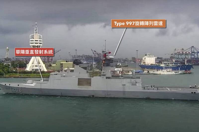 康定級巡防艦承德艦去年7月亮相時的畫面。(資料照,擷取自高雄第二港口直播影片;記者涂鉅旻製圖)