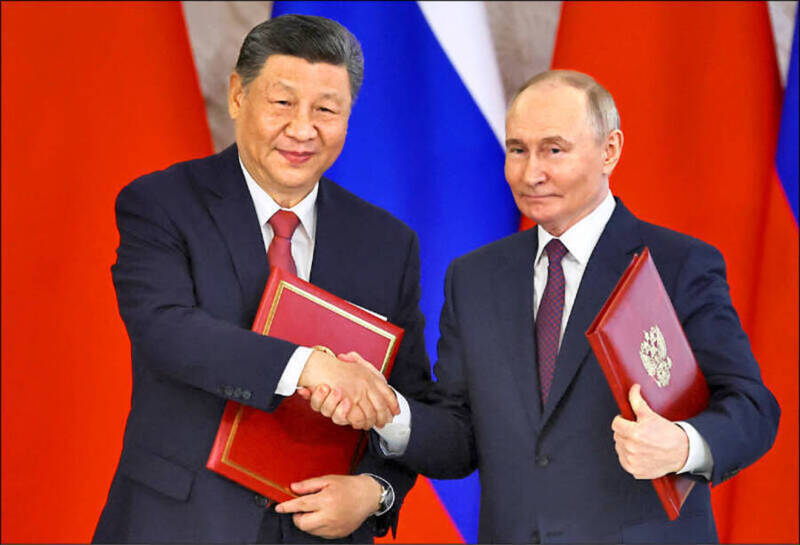 英國專家揭露,俄羅斯雖未獲直接軍援,但靠著中國「暗中輸血」才得以維持6成戰爭運作,雙方地位已出現結構性逆轉。圖為中國國家主席習近平(左)2025年5月8日會晤俄國總統普廷(右)。(路透檔案照)