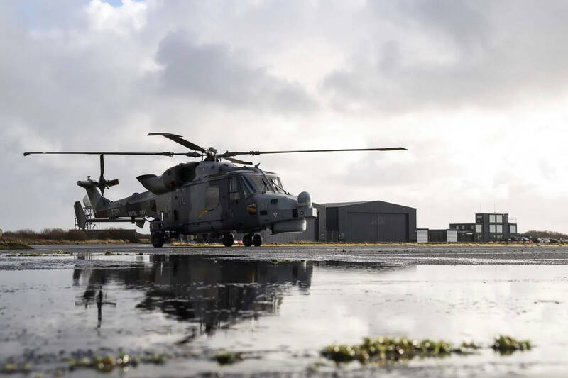 英國皇家海軍日前首次以「野貓」AW159直升機結合多款無人機進行協同作戰測試,透過感測網路模擬對視距與地平線外目標打擊。(圖取自英國海軍)