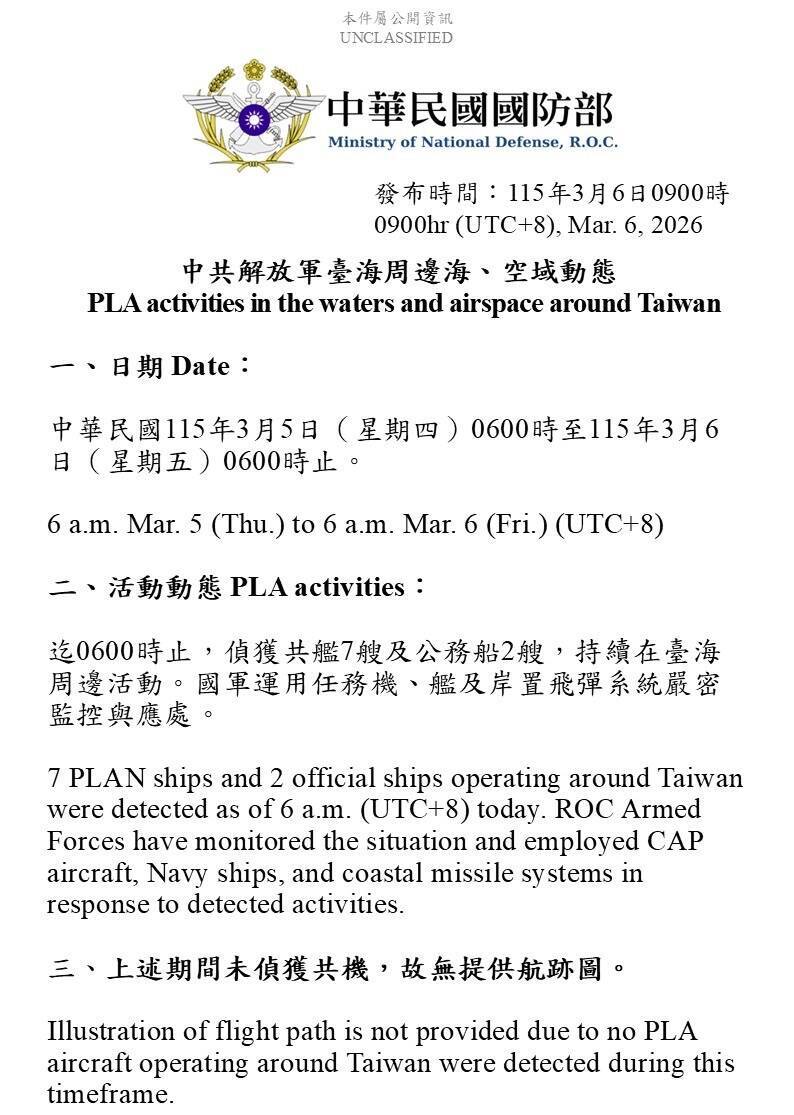 〔記者方瑋立/台北報導〕中共持續對台遂行軍事施壓及灰色地帶襲擾,國防部今天(6日)公布,自昨(5日)上午6時至今上午6時止,偵獲中共海軍艦艇7艘及公務船2艘,持續在台海周邊活動。