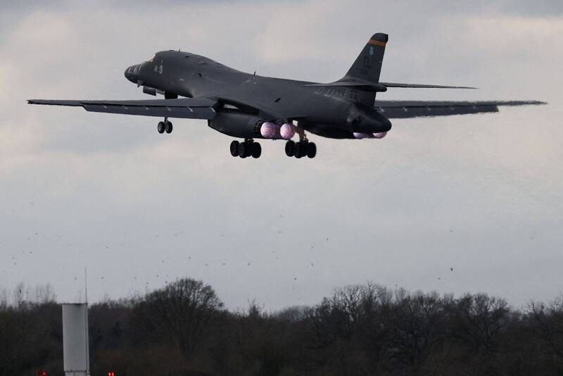 美軍B1轟炸機10日自英國費爾福德空軍基地起飛執行任務。(路透)