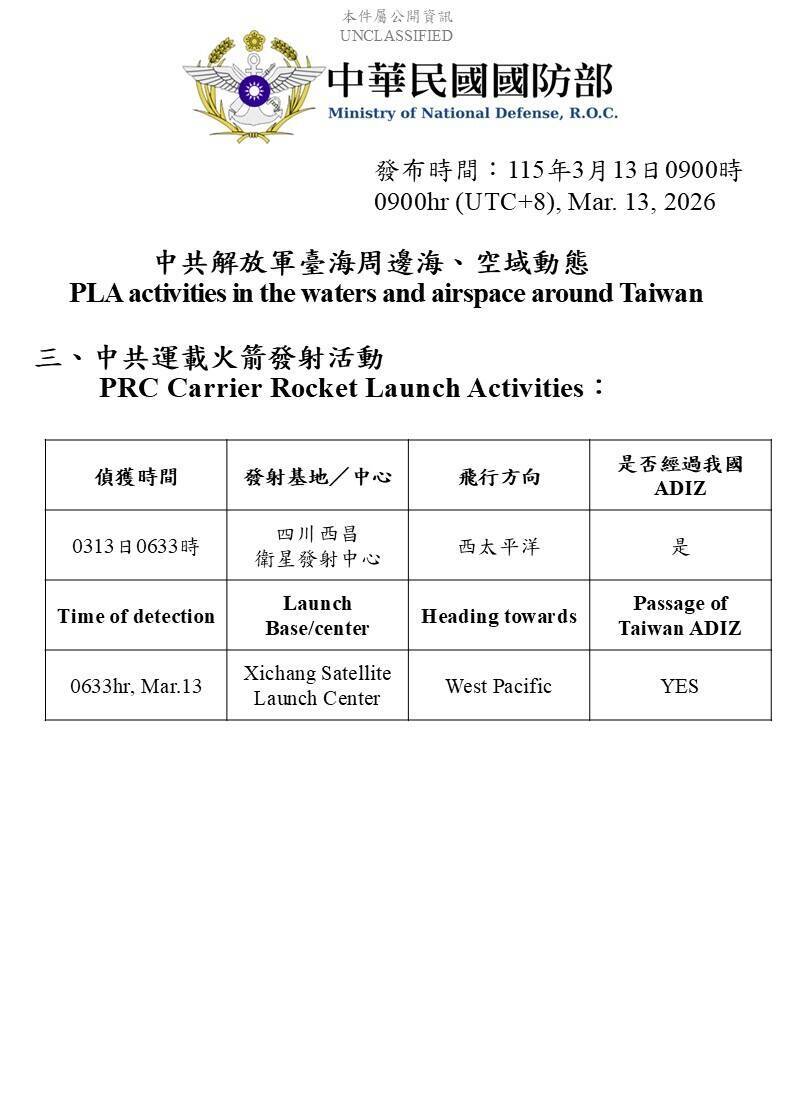 此外,國軍今天上午6時33分偵獲中共於四川西昌衛星發射中心執行運載火箭發射活動。該火箭飛行方向朝向西太平洋,並且經過我國防空識別區。
