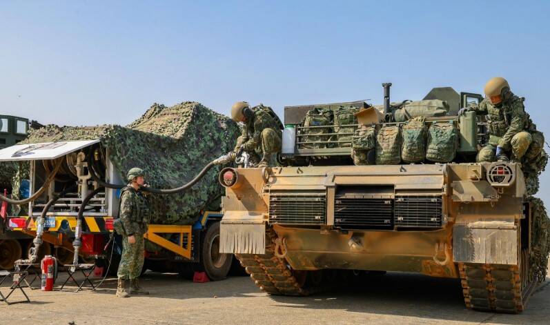 陸軍在「新式基地訓練CTC 2.0」之中,派出新式通用型油罐車為兩輛M1A2T戰車進行油料補給。(取自青年日報)