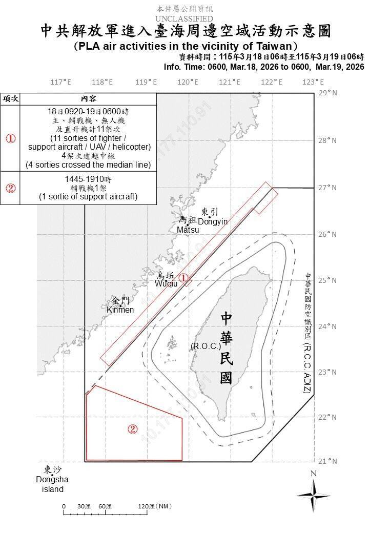 〔記者方瑋立/台北報導〕中國持續對台遂行灰色地帶襲擾,國防部今天(19日)公布,自昨(18日)上午6時起至今日上午6時止,偵獲中共軍機12架次、軍艦9艘及公務船2艘,持續在台海周邊活動。其中有5架次軍機逾越台海中線,進入我國北部、中部及西南空域。