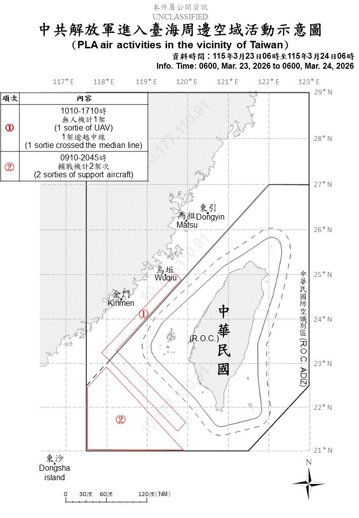 〔記者方瑋立/台北報導〕中國持續對台進行灰色地帶襲擾,國防部今天(24日)公布,自昨日(23日)上午6時至今日(24日)上午6時止,偵獲中共軍機3架次、軍艦9艘及公務船1艘,持續在台海周邊活動。其中3架次軍機全數逾越台海中線,並進入我西南空域活動。