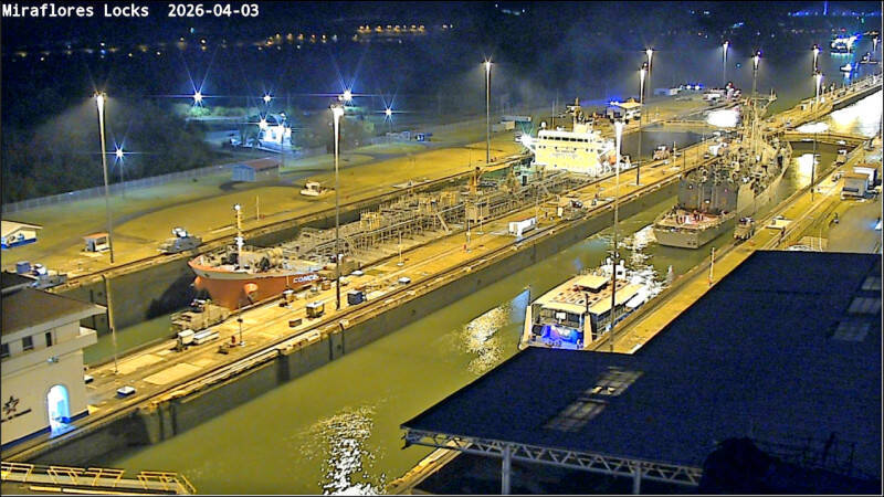 根據巴拿馬運河直播影像,海軍敦睦艦隊已陸續駛入巴拿馬運河。圖為岳飛艦於當地時間3日進入米拉弗洛雷斯閘門。(「諸葛風雲的異想世界」臉書提供)